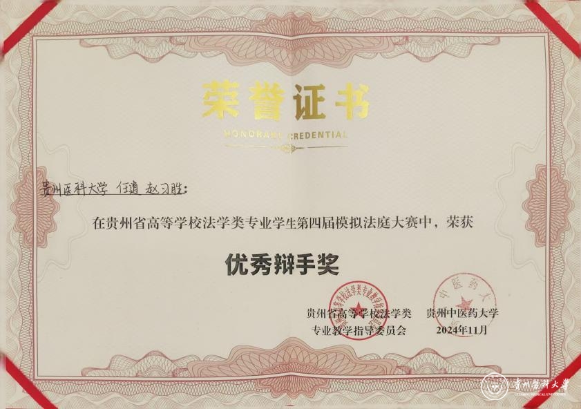 本次参赛队由李牧、李红老师指导,医学人文学院2022级法学专业任逍、赵习胜、王均丽、陈婷婷、熊贤梅、雷盼盼六名同学参赛。经过初赛评比,包括我校在内的共八支贵州省法学专业院校队伍进入复赛,在复赛中,我校同学展现了深厚的法律功底和严谨的逻辑思维能力,以最高分进入总决赛,并最终获得了团体第二名的好成绩。任逍、赵习胜同学获得优秀辩手奖,法律文书获最佳起诉书三等奖、最佳辩护词三等奖,李牧、李红老师获得优秀指导教师奖。