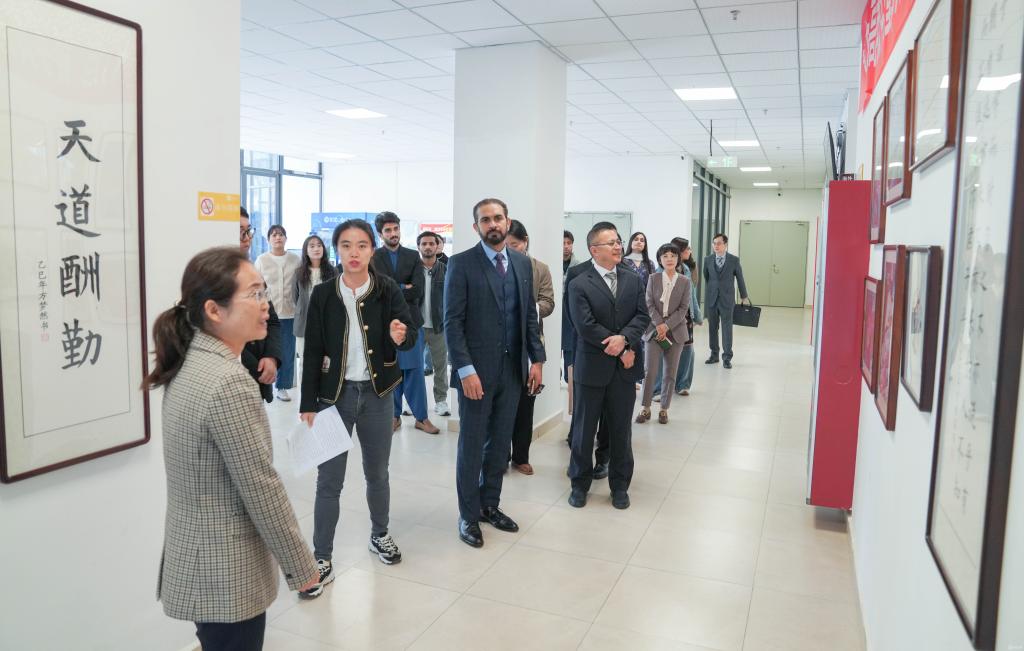 在潘卫东陪同下,坦维尔总领事一行先后参观了学校总体环境和海外教育学院,重点了解学校国际化办学布局与留学生培养体系,深入学生群体看望巴基斯坦籍留学生,与学子们亲切互动,关切询问学习进度与生活状况。他对学校的办学环境、教学质量给予高度认可,对学生在贵医的成长与发展表示满意,同时由衷感谢学校为巴基斯坦留学生提供的悉心照顾与全方位支持,鼓励学子们以专业能力为纽带,搭建中巴文化与学术交流的坚实桥梁。