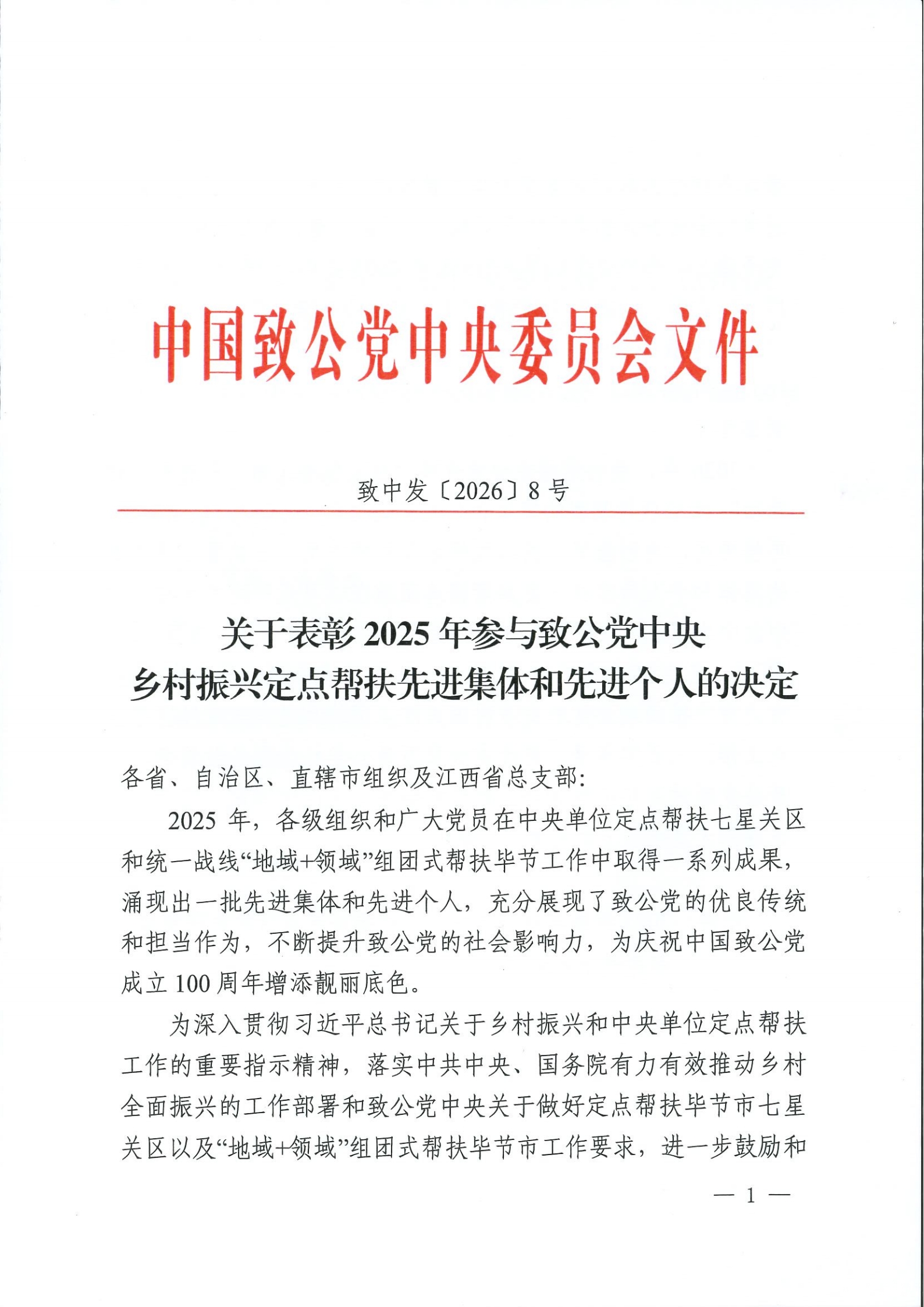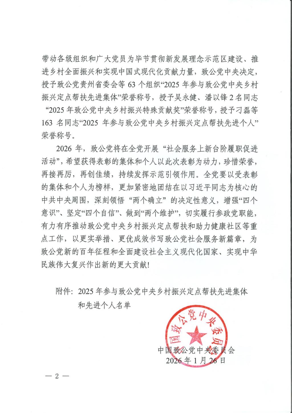 2025年,在致公党中央的统一部署下,各级致公党组织和广大致公党党员在致公党中央定点帮扶七星关区和统一战线“地域+领域”组团式帮扶毕节工作中担当作为、履职尽责,涌现出一批先进典型。我校致公党党员李湘海、罗语思主动投身乡村振兴一线,以实际行动践行致公党“致力为公、侨海报国”的宗旨,充分展现了我校致公党党员的良好风貌。