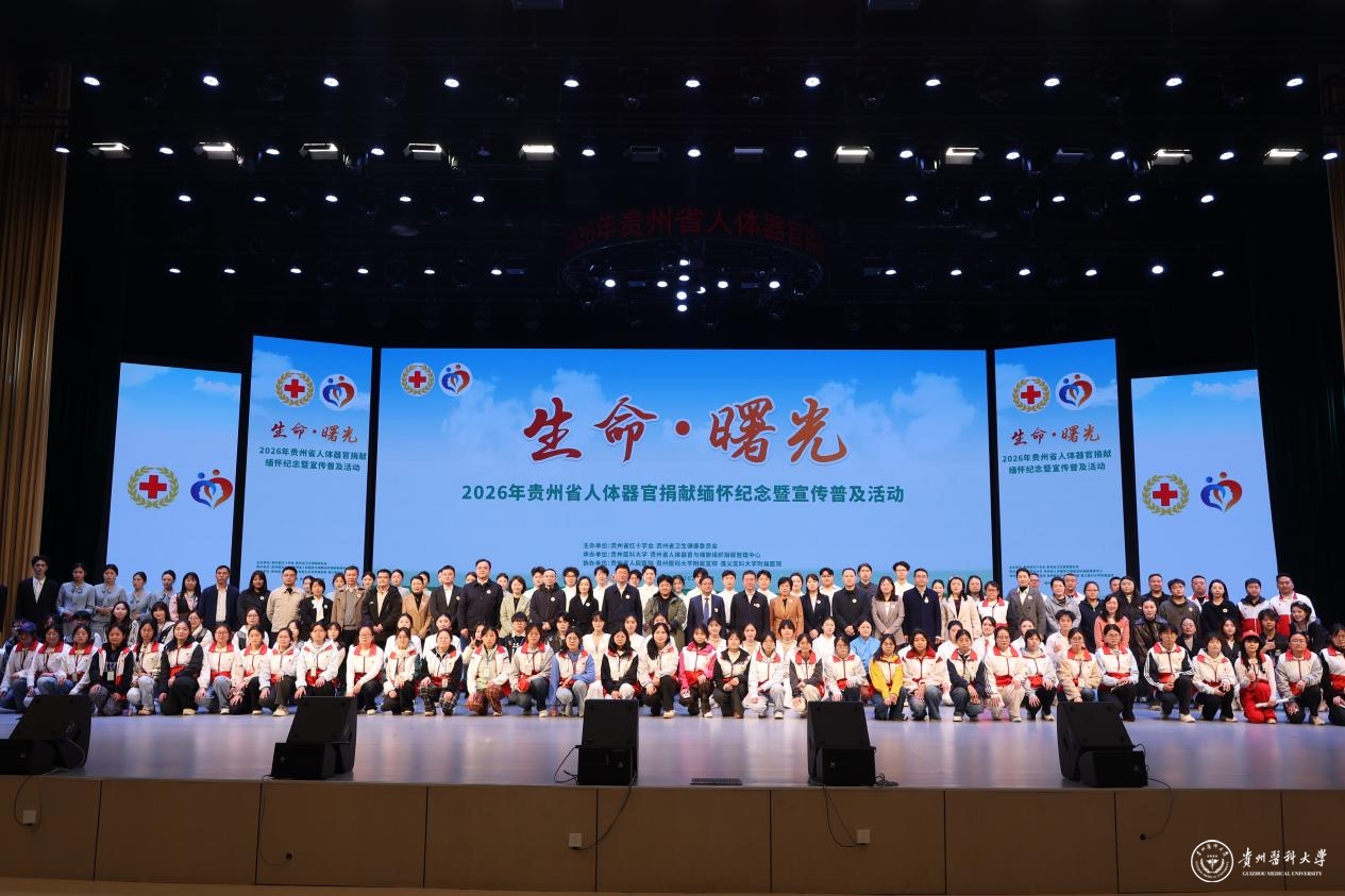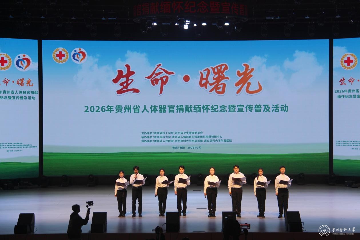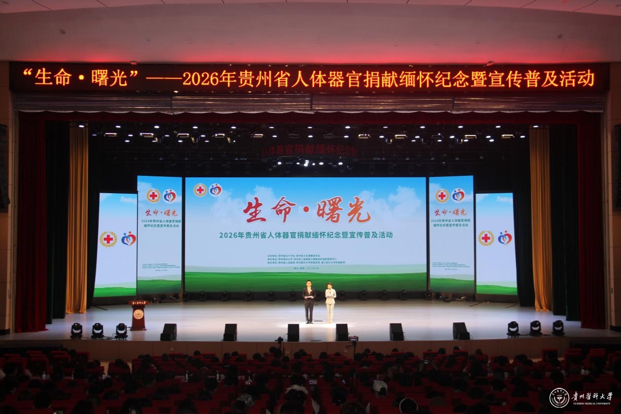 近日,由贵州省红十字会、贵州省卫生健康委员会主办,贵州医科大学、贵州省人体器官与细胞组织捐献管理中心承办,贵州省人民医院、贵州医科大学附属医院、遵义医科大学附属医院协办的“生命·曙光”——2026年贵州省人体器官捐献缅怀纪念暨宣传普及活动在我校云漫湖校区大礼堂举行。