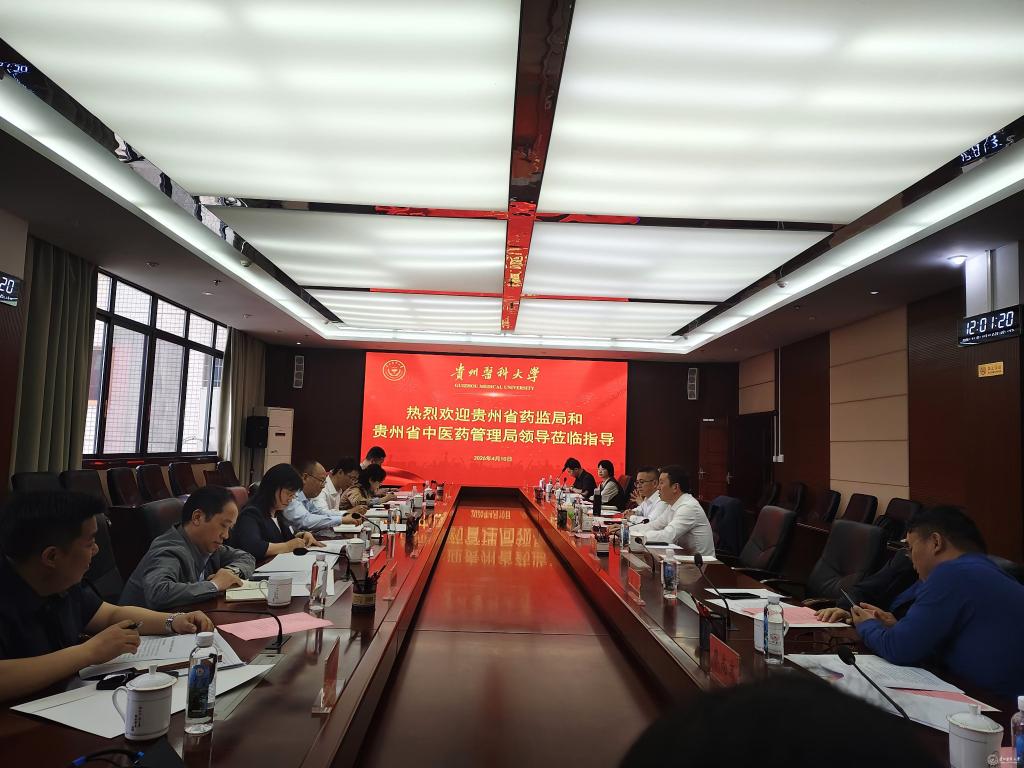 4月10日,贵州省药品监督管理局党组书记、局长王训伟一行来我校开展调研交流。省药监局党组成员、副局长杨长福和省中医药管理局科技教育处处长丁群等相关部门负责人出席座谈会,校党委书记汤磊,副校长潘卫东、副校长罗成及相关部门负责人参加。
