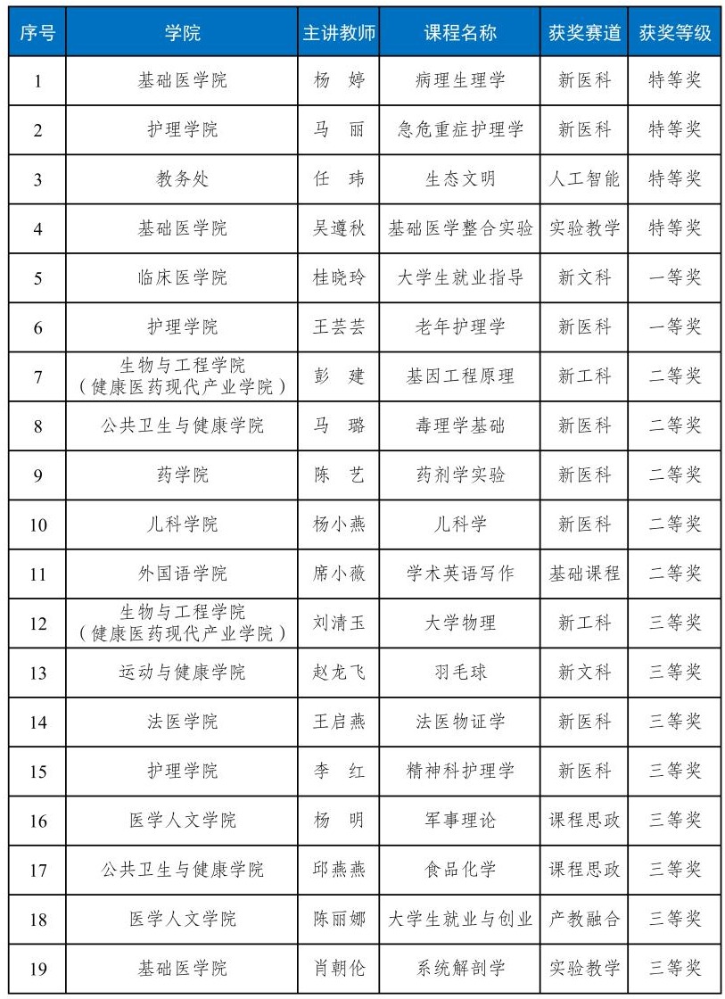 近日,贵州省第六届高校教师教学创新大赛获奖名单正式公布。经过网络评审、现场汇报等环节激烈角逐,我校19名教师(团队)凭借出色的教学创新成果脱颖而出,共获得特等奖4项,一等奖2项,二等奖5项,三等奖8项。获奖数量与等级均创历史新高,并且在新医科、新工科、新文科、人工智能、实验教学等多个赛道均实现新突破,充分展现了我校教师丰硕的教学创新成果,也是学校深耕教学改革的有力体现。