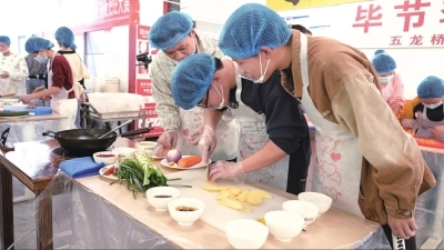 比赛中,只听见锅碗瓢盆齐奏,欢声笑语不断。各参赛队分工协作、有条不紊,校领导和老师也加入进来,在60分钟内完成了一道固定菜品宫保鸡丁和一道自选创意菜品的制作,切配、翻炒、调味、装盘一气呵成,宫保鸡丁的鲜香与自选菜品的创意碰撞,煎炒烹炸的声响与团队协作的笑语交织,四大赛区处处洋溢着热闹的烟火气。