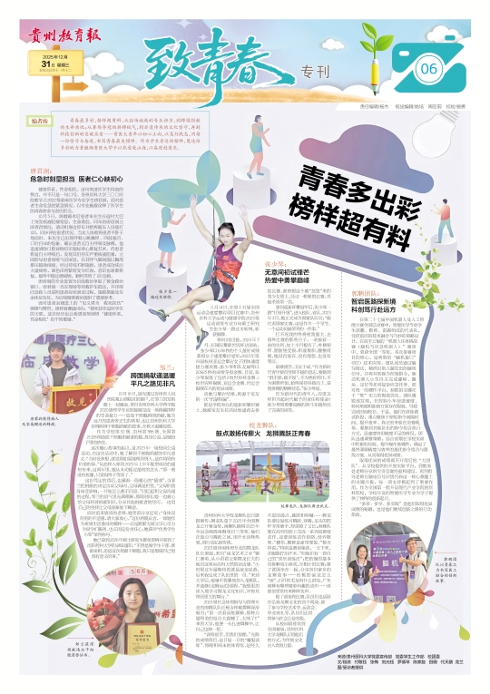 编者按:青春最多彩,榜样超有料,从临场施救的专业担当,到跨国捐献的生命热忱;从赛场夺冠的拼搏锐气,到非遗传承的文化坚守,再到科技创新的突破求索……贵医大青年以初心立向,以笃行践志,用每一份坚守与奋进,书写青春最美模样。作为学生身边的榜样,愿这份多彩的力量激励贵医大学子以热爱赴山海,以奋进赴荣光。