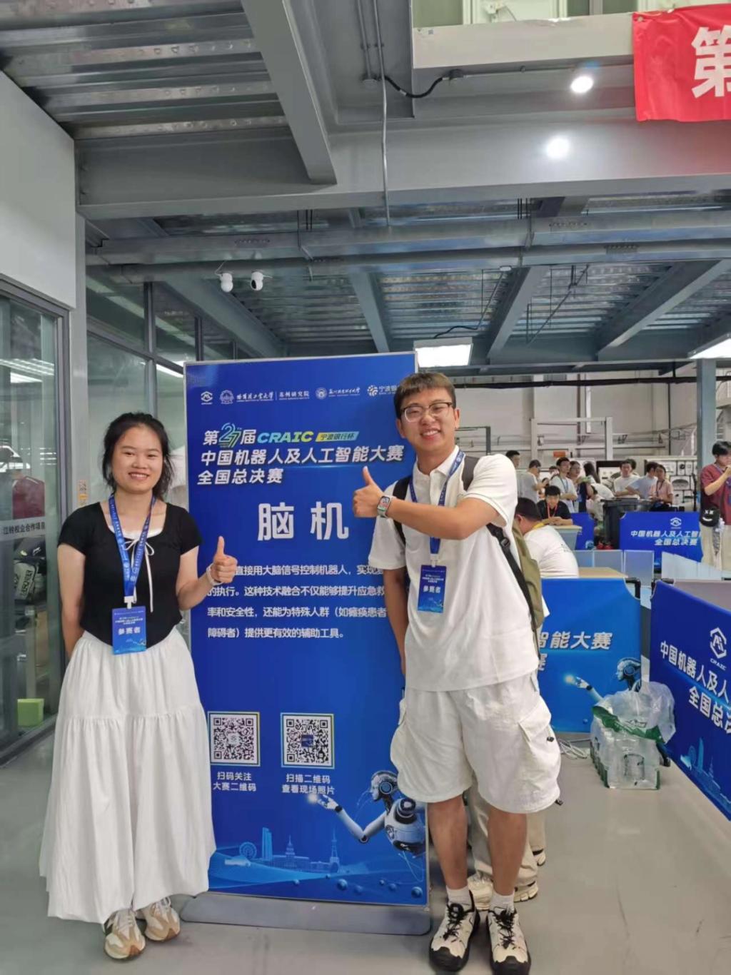 在第二十七届中国机器人及人工智能大赛全国总决赛中,智能医学专业学生郭鹏、靳帅、雷露组成的代表队,凭借前沿的技术融合与巧妙的策略设计,在高手云集的“机器人任务挑战赛 (脑机与应急机器人)”赛项中,荣获全国一等奖。本次参赛项目的核心,是典型的“脑机接口”(BCI) 技术应用。团队成员通过编写算法,精准识别人脑发出的脑电信号,并将其转换为控制指令,驱动机器人小车自主完成避障、搬运、定位等系列复杂应急任务。面对统一的硬件平台,制胜的关键在于“软”实力的极致优化。团队敏锐地发现,在控制小车前进速度、转向角度和距离方面存在限制,导致完成时间较长。于是,他们在训练调试阶段,重点聚焦于缩短指令间隔时间,提升效率。真正的考验在决赛现场。观察到其他队伍的指令组合执行方式,虽速度快但精度不足的情况,团队迅速调整策略,结合前期在学校实训中积累的经验,提升操作准确性,确定了最终兼顾精度与效率的最优指令组合与路线方案,从而取得优异成绩。