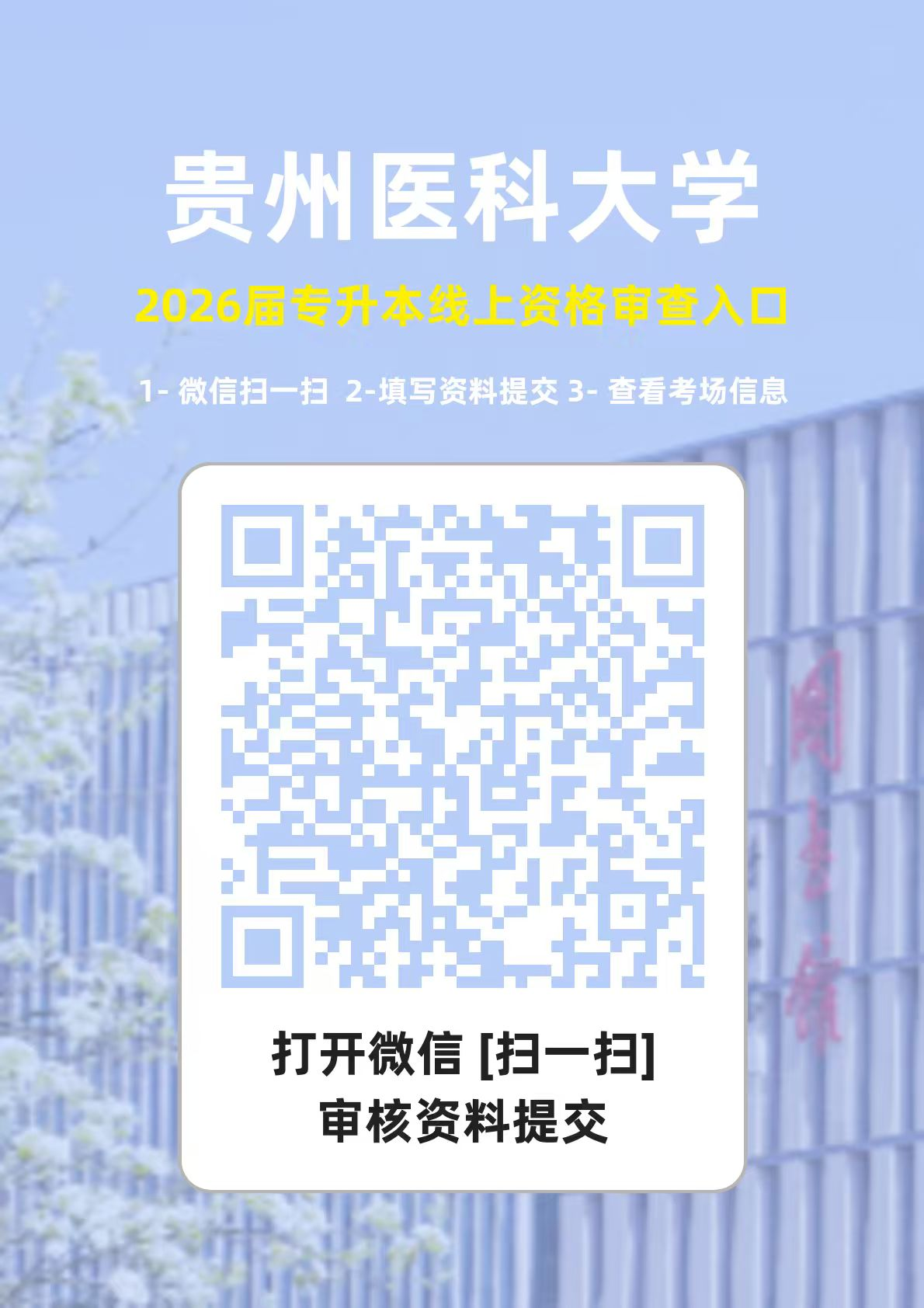 1、所有学生根据要求在线上提交审查资料,扫描二维码,使用考生号、身份证号登录贵州医科大学报名资格审查小程序,上传相关材料;