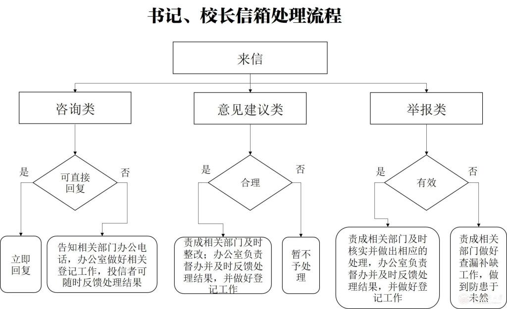 凡是提交到我校“书记信箱”“校长信箱”信件,所反映的情况应该是学校范畴内相关事项,所反映的情况必须客观、属实。若反映问题事实不清、所提建议理由不充分、联系方式无效、无法核实内容真实性、不属于我校管辖范围的信件,私人信函、邀请函等不属于受理范围。