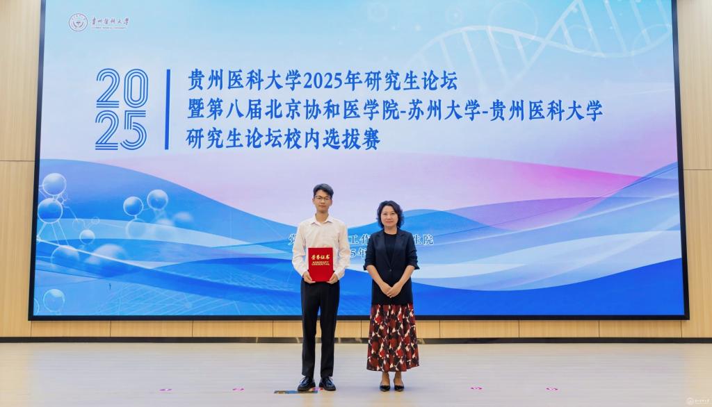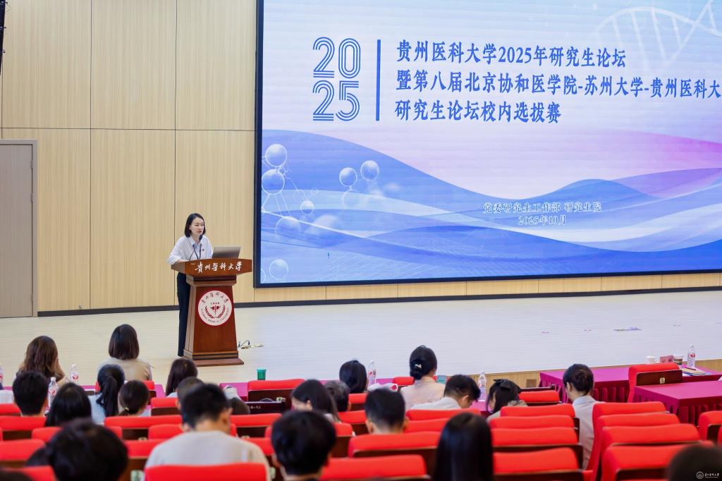 10月11日,贵州医科大学2025年研究生论坛暨第八届北京协和医学院-苏州大学-贵州医科大学研究生论坛校内选拔赛在云漫湖校区道德讲堂举行,论坛由党委研究生工作部、研究生院主办。校党委委员、副校长齐晓岚出席论坛并致辞,附属医院科研处处长刘丽荣、贵州省分子生物学重点实验室副主任洪伟、公共卫生与健康学院潘雪莉教授、贵州省药物制剂重点实验室何彬教授、附属医院消化内科宋铃榆博士担任本次论坛专家评委。党委研究生工作部部长陈思颖、研究生院副院长梅梅、令狐艳、药学院副院长廖尚高、公共卫生与健康学院副院长王大朋、法医学院副院长任峥等各研究生培养学院研究生工作分管领导、研究生导师和研究生代表参加论坛。