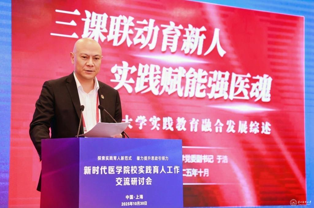校党委副书记于浩在会上作主题分享,介绍了我校实践育人工作的思路与成效。他谈到,学校立足医学教育特色,紧扣“医-工-农结合”发展方向,以主课堂为根基、第二课堂作延伸、实践课堂促拓展,构建专业实践精耕细作、社区实践润物无声、社会实践扎根大地的三维实践教育体系,让育人链条贯穿理论学习与实践锻炼全过程,为培养医德高尚、本领过硬的新时代医学人才注入强劲动力。