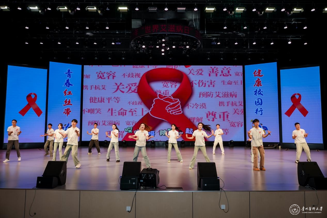 活动现场,全体师生观看了共青团贵州省委策划制作的防艾宣传短片《让青春无“艾”——青春零艾滋,健康向未来》,深入领会“预防为主”理念,增强自我防护意识和能力。随后的防艾主题系列展示以思想引领与知识普及为目的,以青少年喜闻乐见的方式让科学防艾理念入心入脑。《拥抱你》防艾主题合唱传递“消除歧视、关爱包容”的理念,《以“艾”之名,温暖相拥》情景剧生动揭示艾滋病传播风险与防护要点,《医路青春,无艾明天》主题朗诵展现青少年主动参与防艾行动、守护青春健康的责任担当,《防艾一起来,健康向未来》健康操实现了艺术传播与教育引导有机统一。