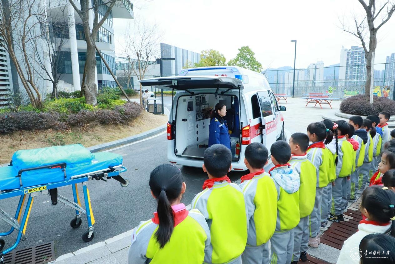 活动筹备阶段,党委研究生工作部与北京市芳草地国际学校贵阳分校展开深度对接,立足1-6年级不同年龄段学生的认知规律与成长需求,量身打造分层分类的活动方案。活动当天,来自我校临床医学、公共卫生、口腔医学、应用心理等多个专业的党员师生,以及附属医院急诊科的医护骨干、研究生“朋辈”心理健康协会成员,分班级深入校园课堂与户外场地。低年级教室里,趣味口腔保健模型吸引着孩子们的目光,研究生志愿者通过互动游戏,将护牙知识传递给每一位小朋友;中高年级的课堂上,人体奥秘讲解、常见疾病预防科普轮番上演,生动的案例让抽象的医学知识变得通俗易懂;六年级的学生则围坐在一起,在心理健康团辅活动中学习压力调节小技巧,筑牢心理防线。与此同时,低年级学段全体师生还近距离参观了急救车,在医护人员的指导下学习心肺复苏等基础急救技能,沉浸式感受医者担当。两校党员教师全程参与、紧密配合,在实践中积累跨学科健康教育经验,进一步凝聚起协同育人的共识与力量。