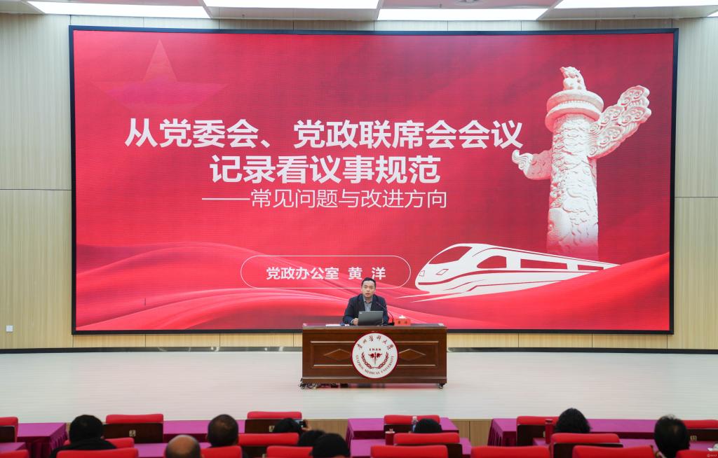 党政办公室秘书科科长黄洋以“从党委会、党政联席会会议记录看议事规范——常见问题与改进方向”为主题,通过讲解2025年度“两个会议”议事规则执行情况,并与2024年执行情况进行对比分析,提出规范“两个会议”议事规则的对策建议。