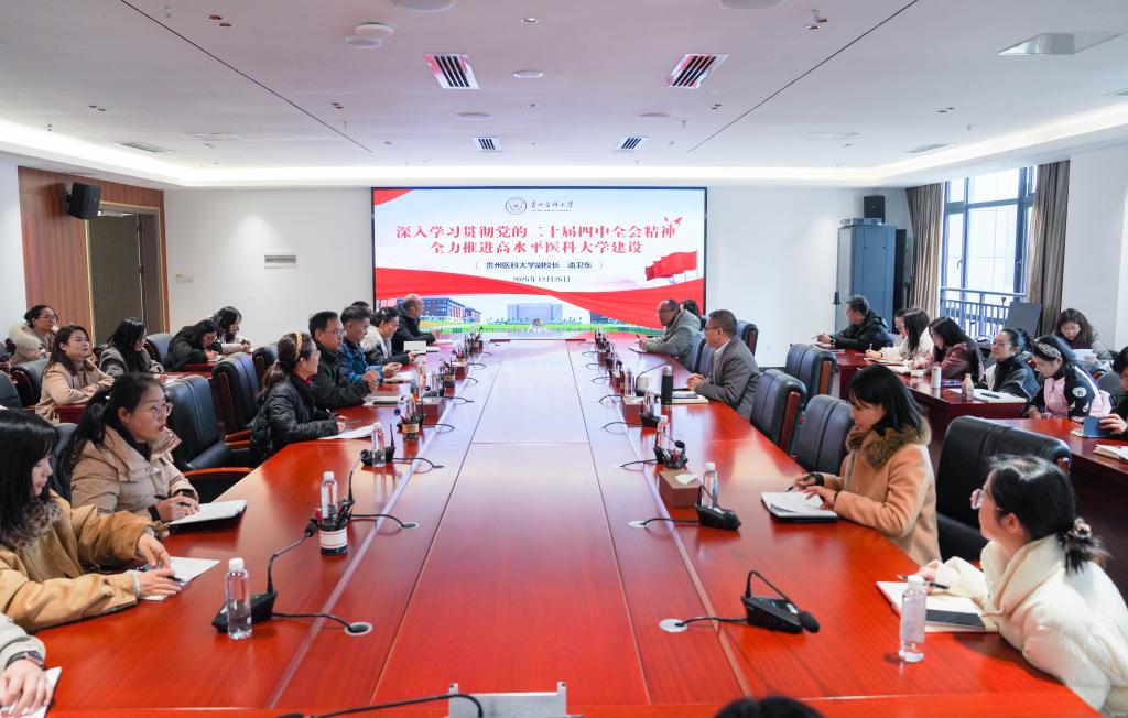 结合医学高等教育发展实际和学校办学定位,潘卫东重点解读了全会对“完善科技创新体系”“加快健康中国建设”“加强高素质专业化人才队伍建设”等重大部署的核心要义。他强调,人民健康是社会主义现代化的重要标志,党的二十届四中全会将“加快建设健康中国”作为重大决策部署,对增进人民健康福祉、推进中国式现代化具有深远影响。我校作为全省医学人才培养和卫生健康事业的重要支撑力量,必须主动对接国家战略和区域需求,将学校发展融入“十五五”规划实施大局。全校上下要将学习贯彻全会精神作为当前和今后一个时期的重要政治任务,深刻领会中国特色社会主义制度和国家治理体系的显著优势,不断增强制度自信,将学习成效转化为推动学校各项事业高质量发展的强大动力,为服务地方经济社会发展、推进健康中国建设贡献贵医力量。