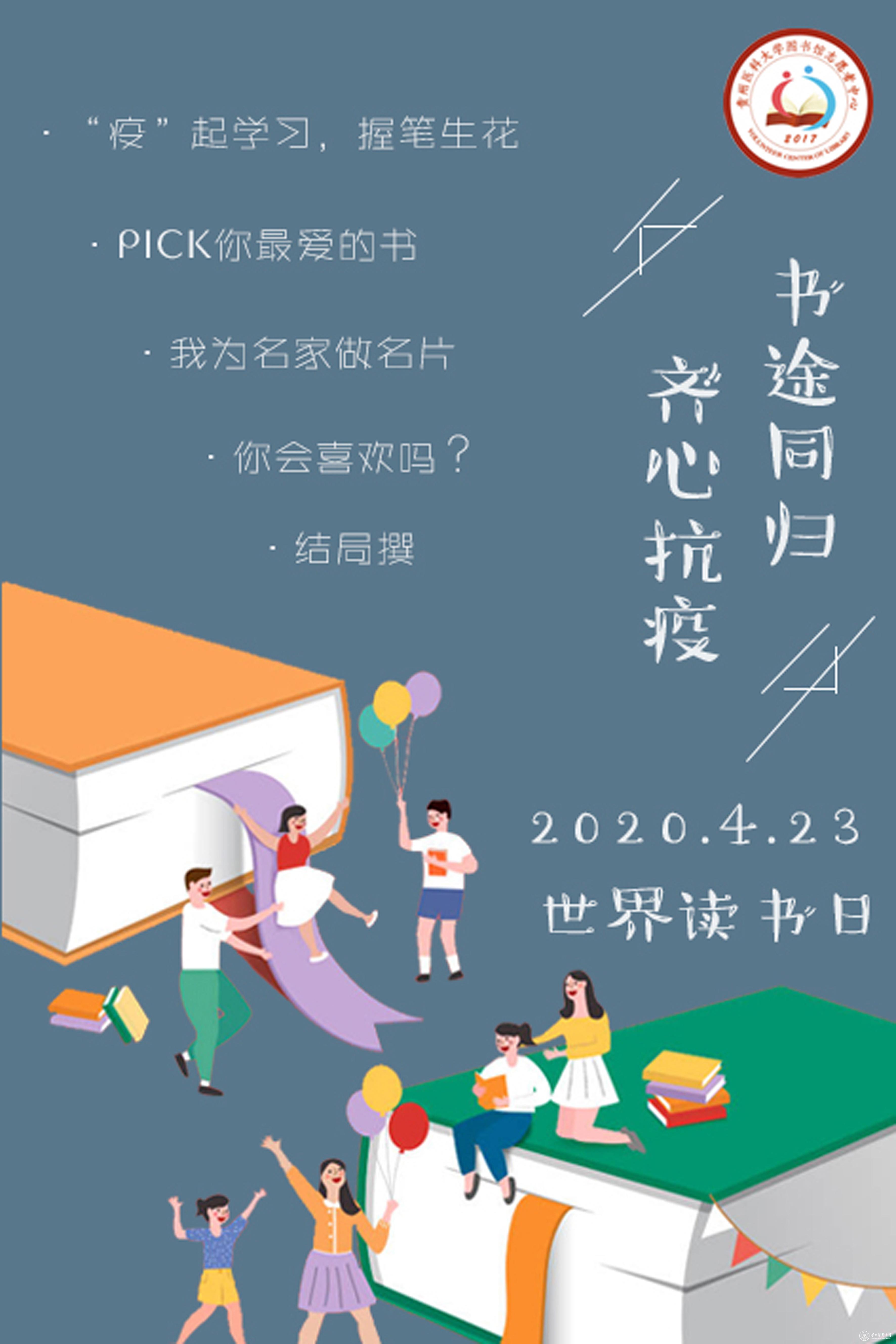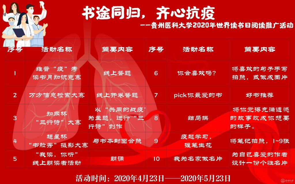 2020年,新冠肺炎肆掠全球,在政府号召与决策下,全国各地停工、停产、停学,绝大部分学校至今仍处于网络复课阶段,我校广大学子现阶段均为居家学习。2020年4月23日正值第二十五个世界读书日,为丰富我校居家防疫学子的居家学习生活、扩展未返校阶段读者阅读方式,为加强学习居家防疫知识、提升阅读的质量,让每一位读者无论身处何地,都能体会阅读的乐趣,我校图书馆将面向全校读者举行贵州医科大学第四届世界读书日活动周。