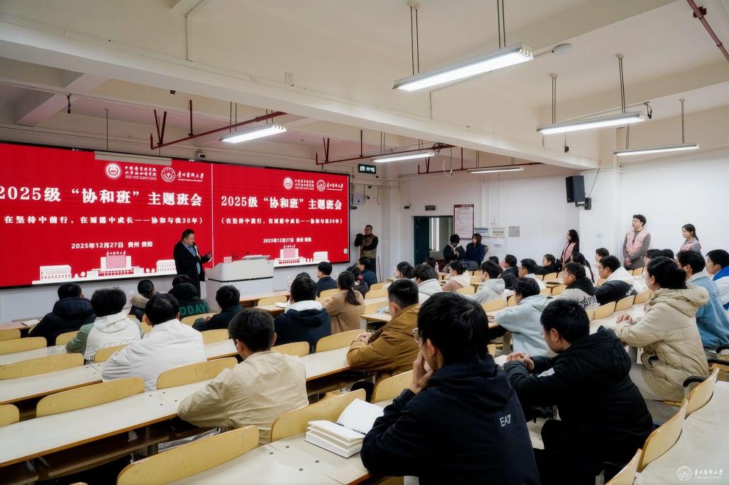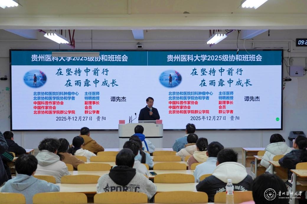 12月27日,北京协和医院妇产科学系副主任、主任医师、2025级“协和班”荣誉班主任谭先杰教授为我校2025级“协和班”开展主题班会。校党委常委、副校长洪峰,对外合作交流处(港澳台事务办公室)副处长彭云,基础医学院党委副书记洪潇潇,2025级“协和班”全体学生及辅导员参加。班会由教学质量监控与评估办公室主任、教务处副处长修江帆主持。