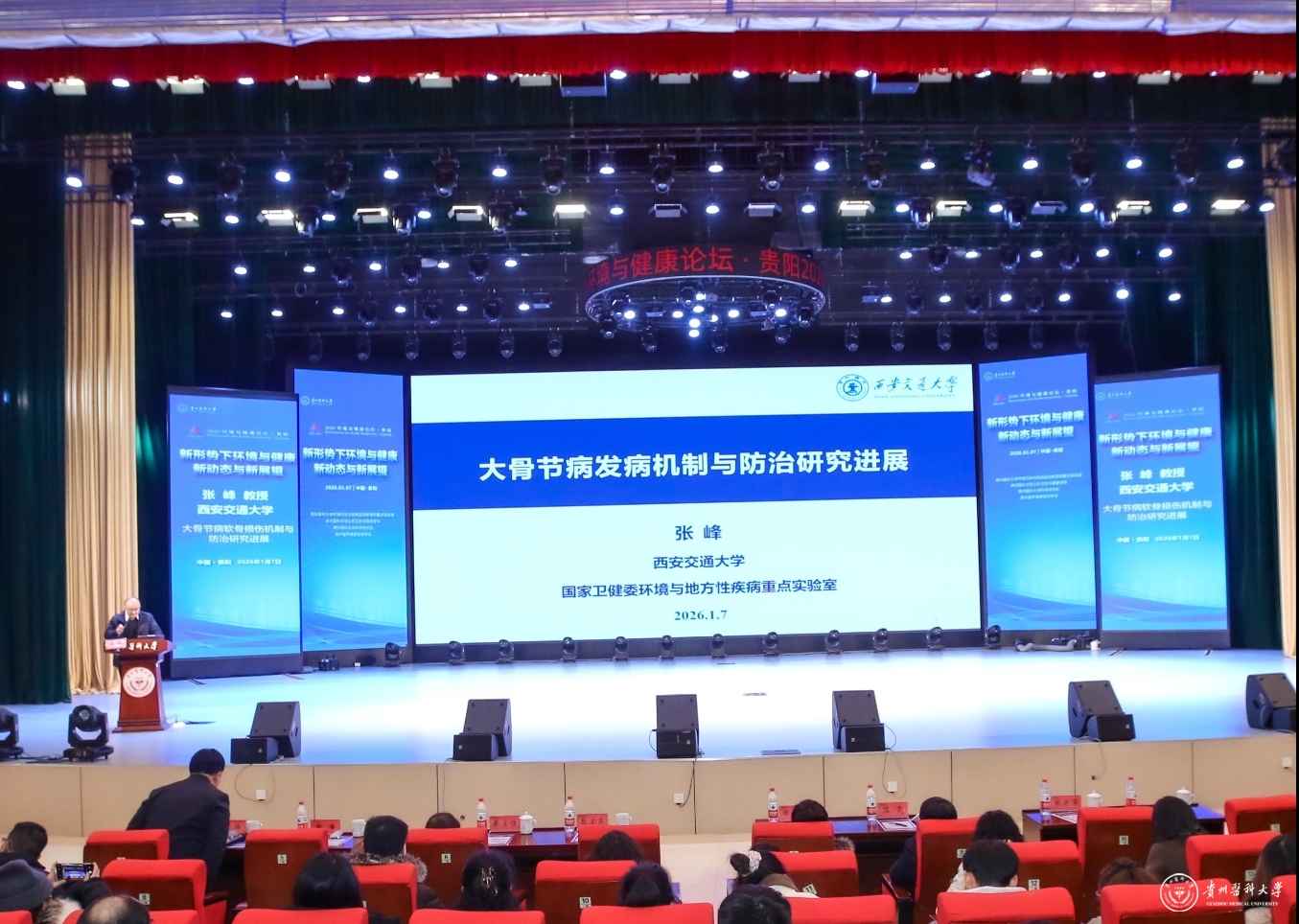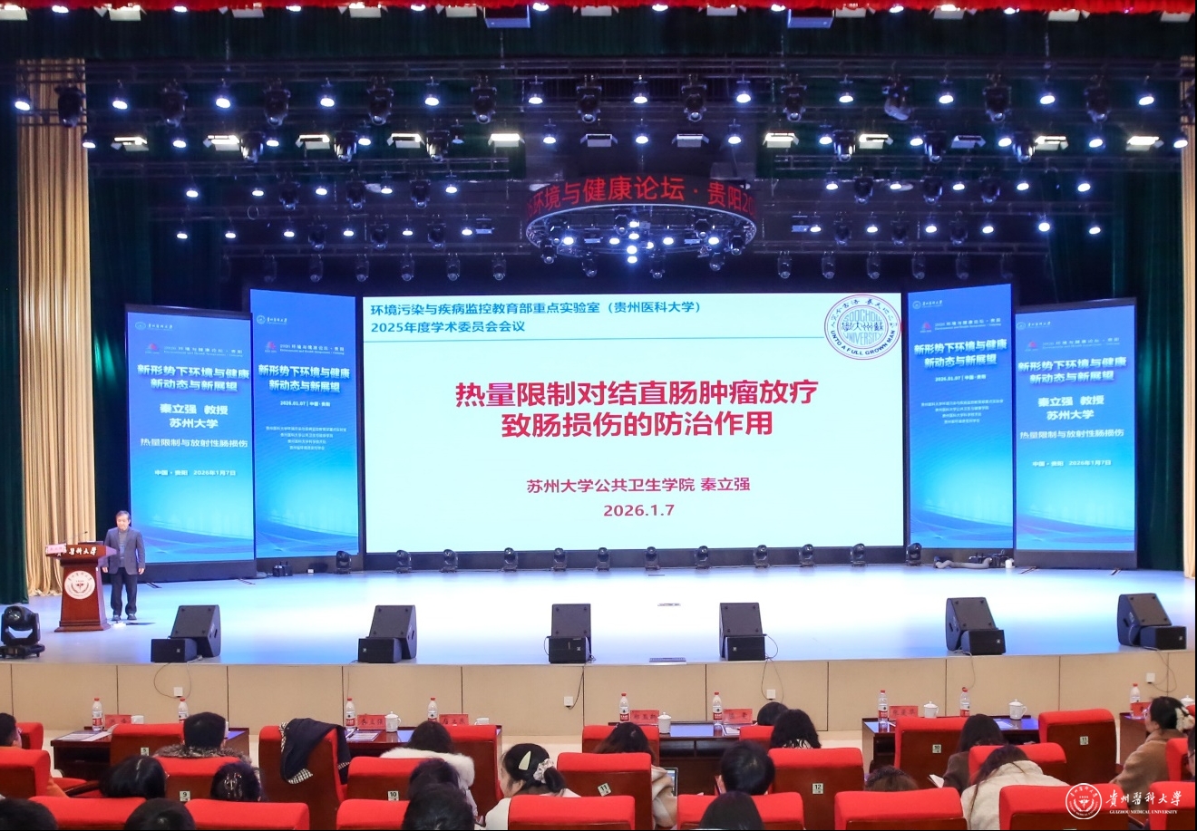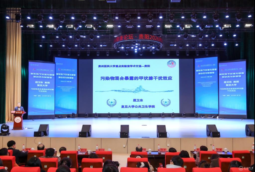 1月7日,以“新形势下环境与健康新动态与新展望”为主题的2026年环境与健康论坛在我校云漫湖校区礼堂召开。论坛由贵州医科大学环境污染与疾病监控教育部重点实验室、公共卫生与健康学院、科学技术处及贵州省环境诱变剂学会联合主办,邀请了青岛大学郑玉新教授、复旦大学屈卫东教授、中山大学陈雯教授、苏州大学秦立强教授、西安交通大学张峰教授作专题报告,共同探讨环境与健康领域前沿动态与发展方向。我校师生代表400余人参加了论坛。