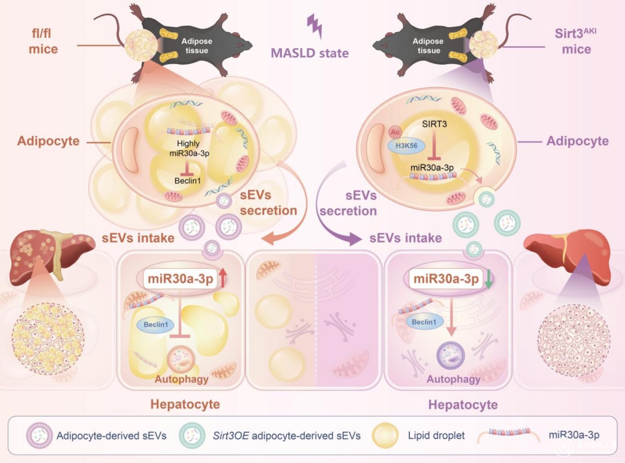 该研究首次系统阐明了脂肪组织通过“sEVs-miRNA”途径与肝脏进行器官间通讯的分子机制,提出了“脂肪组织-肝脏轴”在MASLD发生发展中的重要作用。相关成果不仅加深了对脂肪肝发病机制的认识,也为开发靶向miR-30a-3p的新型治疗策略提供了重要理论基础。
