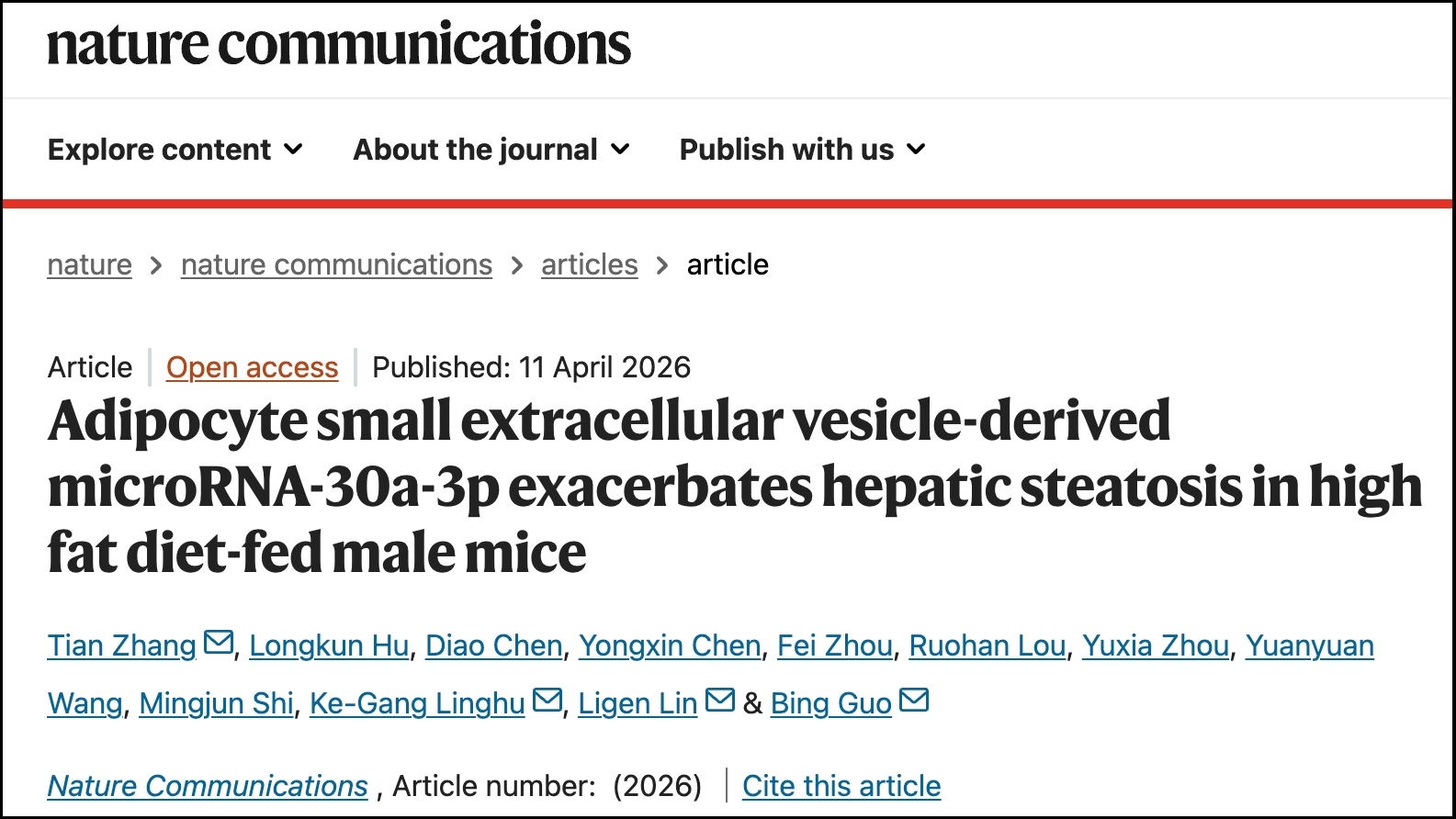 近日,我校贵州省常见慢性疾病发病机制及药物研究重点实验室郭兵教授团队在Nature子刊《Nature Communications》(中科院1区Top期刊,IF:15.7)上发表研究论文“Adipocyte small extracellular vesicle-derived microRNA-30a-3p exacerbates hepatic steatosis in high fat diet-fed male mice”,揭示并阐明了脂肪组织通过细胞间信息传递调控肝脏脂质代谢的新机制,为代谢功能障碍相关脂肪变性肝病的防治提供了新的理论依据和潜在靶点。