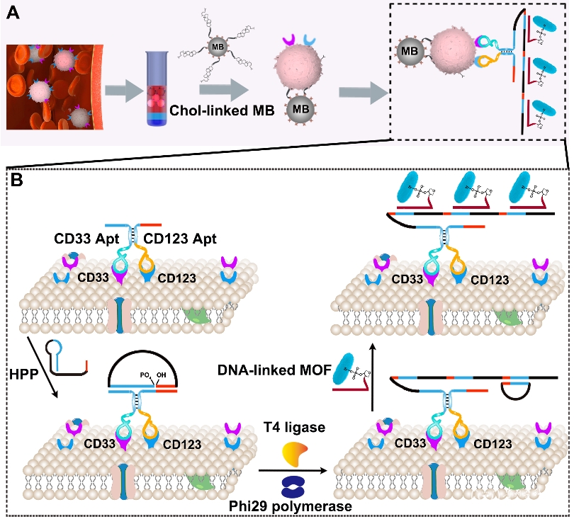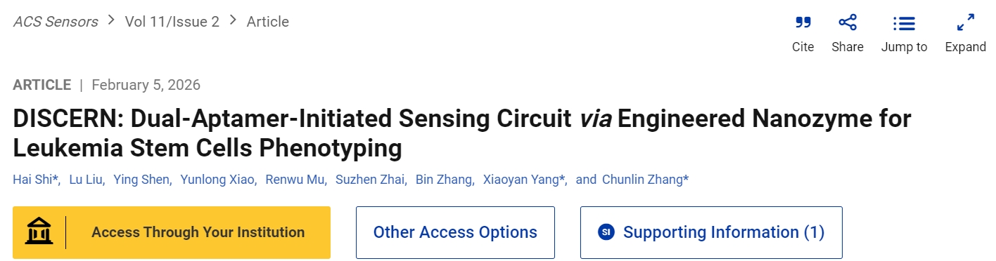我校基础医学院张春林教授团队的石海副教授主导完成的研究论文“DISCERN: Dual-Aptamer-Initiated Sensing Circuit via Engineered Nanozyme for Leukemia Stem Cells Phenotyping”,于2026年2月发表于国际期刊《ACS Sensors》(中科院一区TOP期刊,实时IF:10.4)。该研究开发了名为DISCERN的新型检测平台,通过双适配体启动的传感电路与工程化纳米酶组装,实现对白血病干细胞(LSCs)的高特异性、超灵敏表型分析,检测限低至8 cells/mL,为急性髓系白血病(AML)的复发预测和精准治疗提供了全新工具。